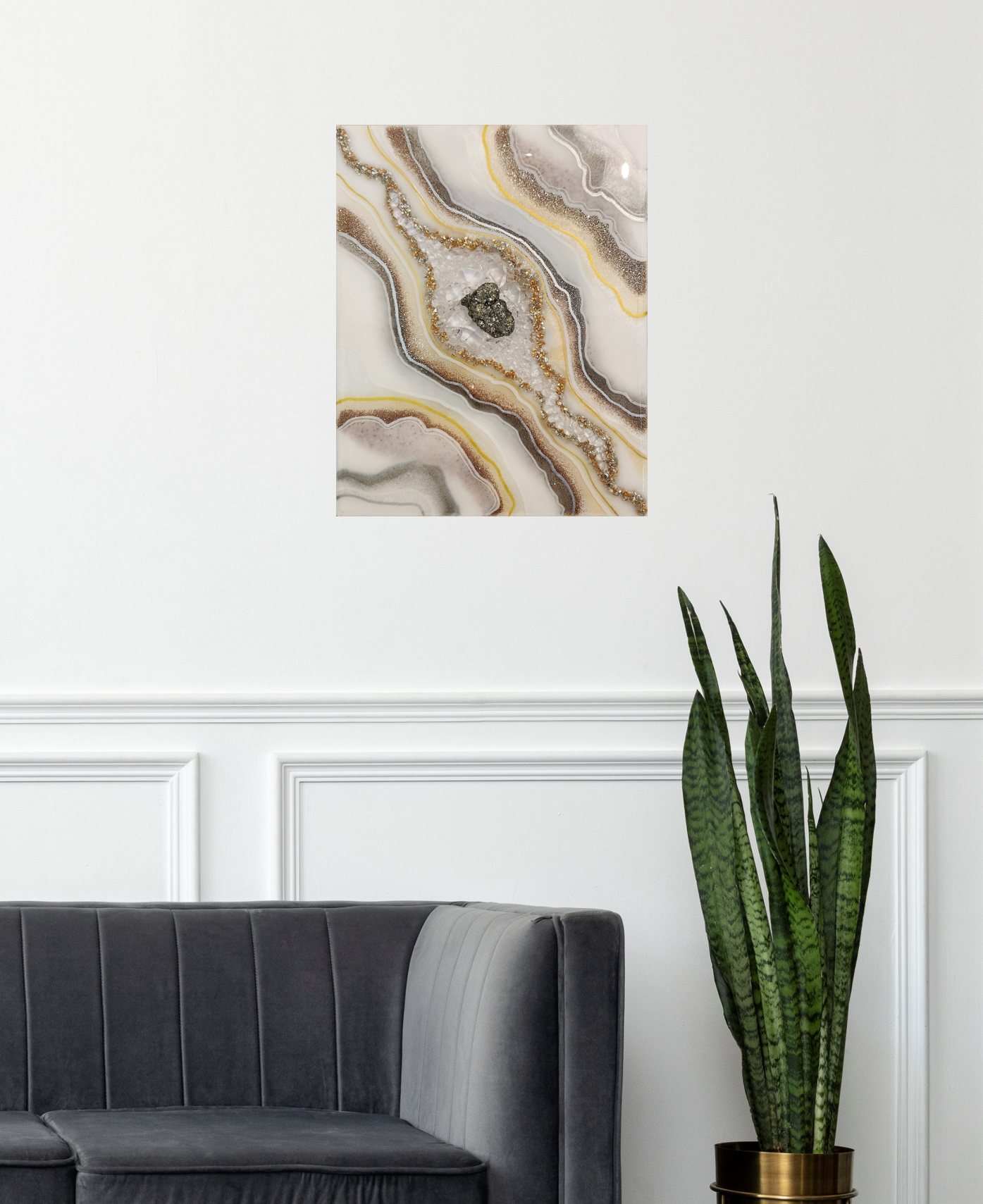 Bring empowerment to your space with a Geode Art piece featuring Pyrite, the stone of strength and vitality. Its golden shimmer sparks confidence, attracts abundance, and shields against negative energy. Let its bold energy inspire motivation and courage that allows this art piece to transform any space into a sanctuary of success and determination.